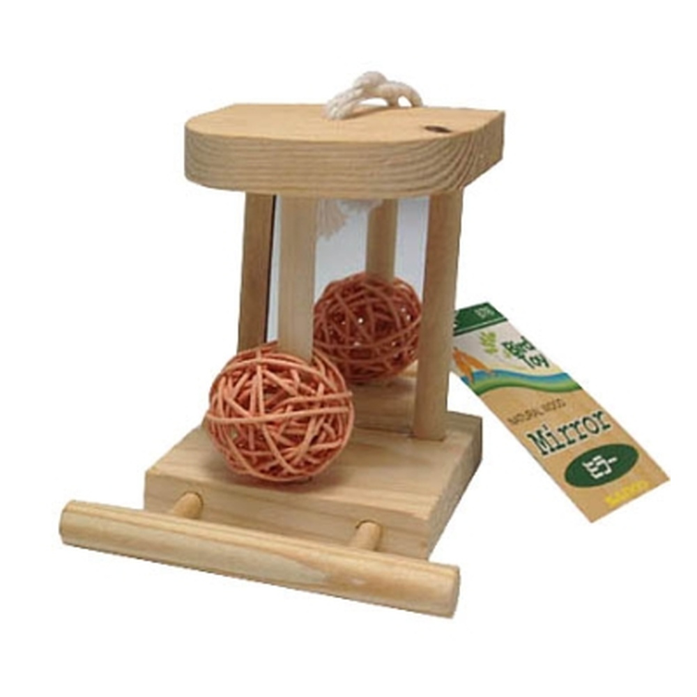 ●鏡にオモチャが付いた、かわいい小鳥用パーチ。
