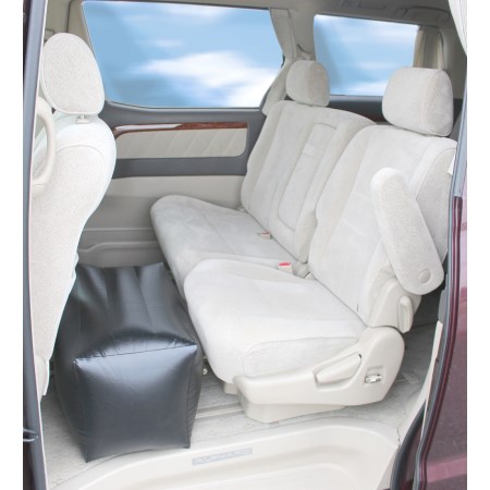 ヴェルファイアやセレナなどのミニバンの2列目シートに置いて足が伸ばせるエアータイプクッションです。