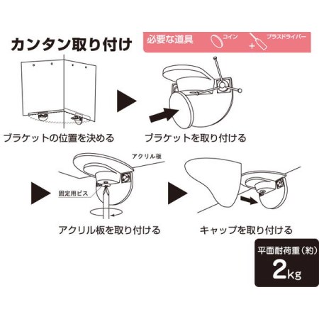 製造国:中国 素材・材質:板:アクリルクリップ:ABS樹脂 仕様:平面耐荷重:約2kgまで必要な道具:コイン、プラスドライバー セット内容:アクリル板、専用取付部品