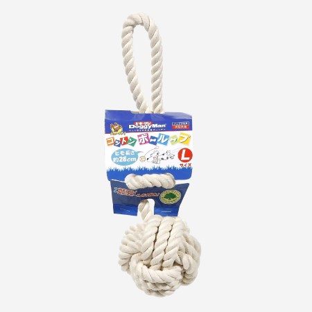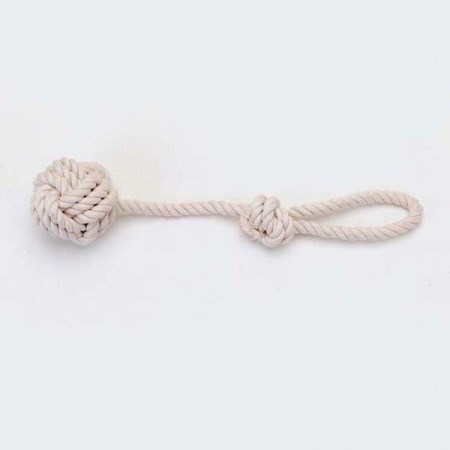 接着剤を使わずにコットンロープを編んだボールにループがついたおもちゃ。オーナーと一緒にでも遊べる。