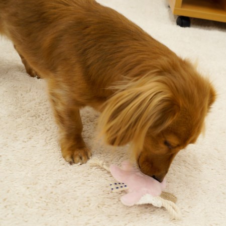 ループ状のねじねじロープ、結びめがあるでこぼこロープ、2種類のコットンロープ。かじりやすい出っ張りは奥歯でガシガシに。