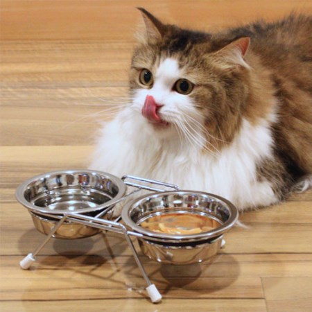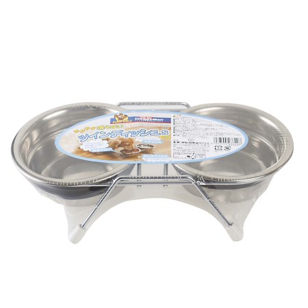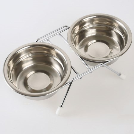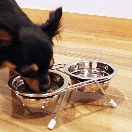水とフードのツインディッシュ。2つのステンレス食器とスタンドのセット。