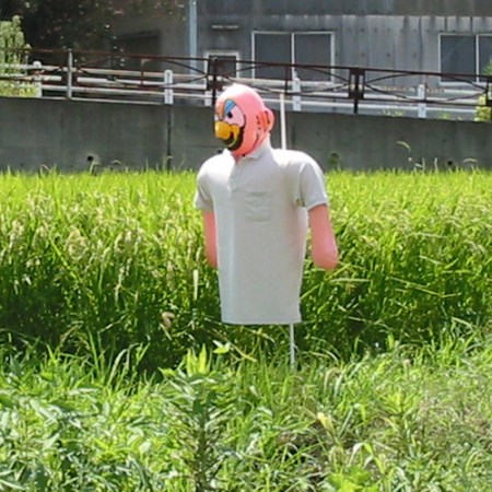 揺れ動くかかしに、カラス、ハト、スズメがビックリ