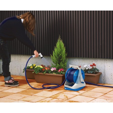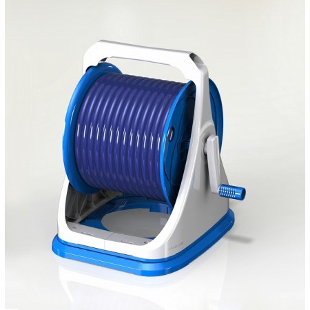 回転台座が付いているのでホースの引き出しや取りまわしのときに本体が倒れにくいホースリールです。
