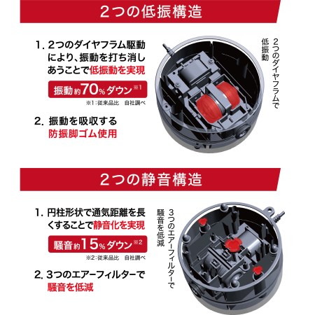 1. 2つのダイヤフラム駆動により、振動を打ち消しあうことで低振動を実現。振動約70%ダウン! ※従来品比 自社調べ 2. 振動を吸収する防振脚ゴム使用