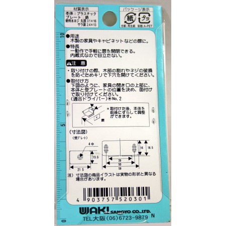 一動作で手軽に扉を開閉出来ます。内蔵式なので目立ちません。木製の家具やキャビネットなどの扉に最適です。取付ネジ付きです。