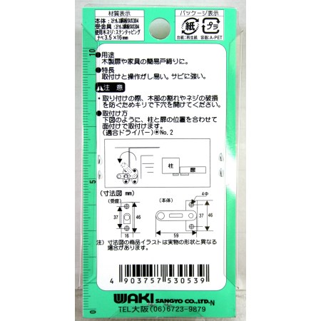 開き戸、勝手口などの内部からの掛金具です。取り付けの適応範囲が広く、操作が簡単です。取付ネジ付きです。
