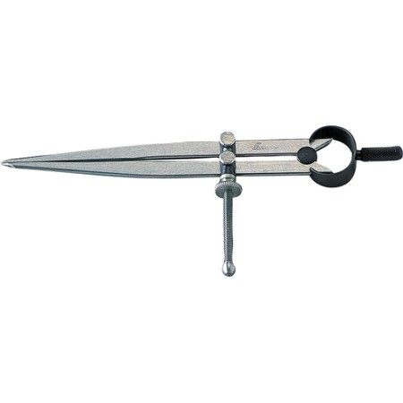 鉄板上の硬い部分に円形をケガくための鋼製コンパス。先端部には焼き入れ加工が施されています。