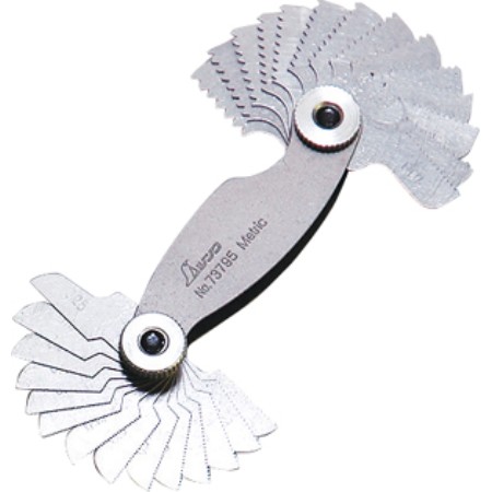 一般のネジのピッチを測定するゲージ。リーフに山と山のピッチを表示しています。